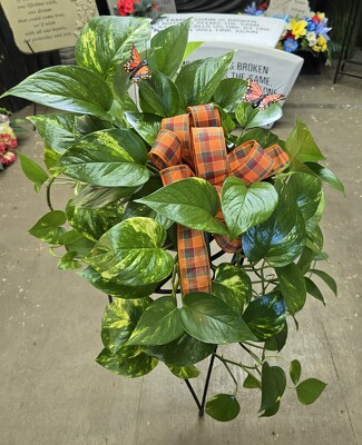 Beautiful green plant, in a 6" pot. Comes in a basket, decorated with butterflies or silk flowers and a bow. Call us to customize, or note on order if you would like a different color or silk flowers instead.