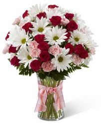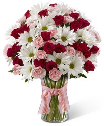 The FTD Sweet Surprises Bouquet is an absolutely charming way to send your warmest sentiments. Deep fuchsia spray roses, pink mini carnations, white traditional daisies and lush greens are sweetly situated in a classic clear glass vase accented with a perfectly pink designer ribbon to create a bouquet that will delight your special recipient at every turn. Approx. 14"H x 10"W