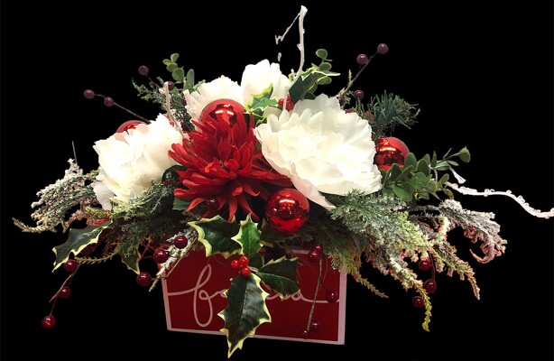 Wooden box with "fa la la" on the side, adorned with seasonal/festive silk flowers. Approx. size: 22"W x 12"H. Local delivery only.