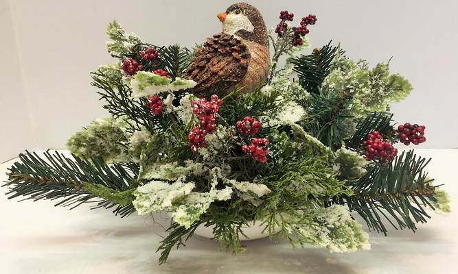 Beautiful silk "bird in nature" arrangement. Approx. size: 14"W x 8"H. Local delivery only.